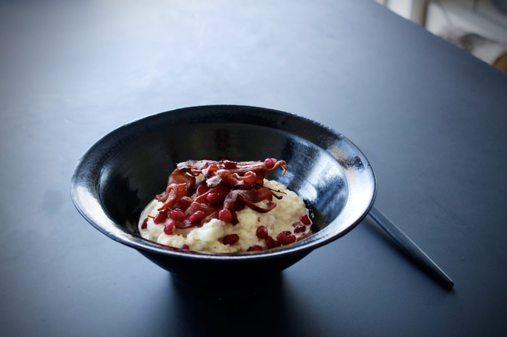 6. Lägg upp purén i skålar och toppa med bacon och granatäppelkärnor.