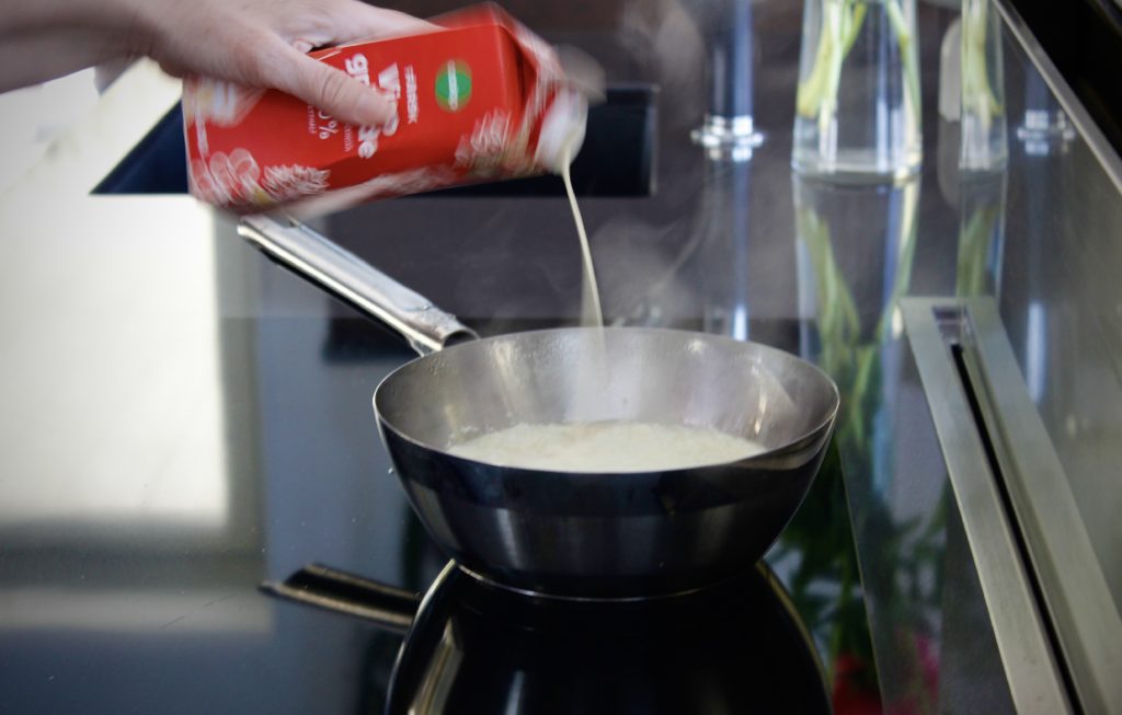 I Evas kök har en doft av bacon börjat sprida sig. En blomkålspuré kryddad med kanel, salt, vitpeppar och lite chili sjuder i kastrullen på spisen.