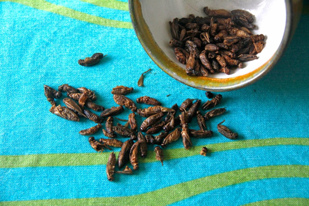 Vid sidan av hamburgaren ligger en hög rostade och saltade syrsor. Anders Engström tar upp en och knaprar.