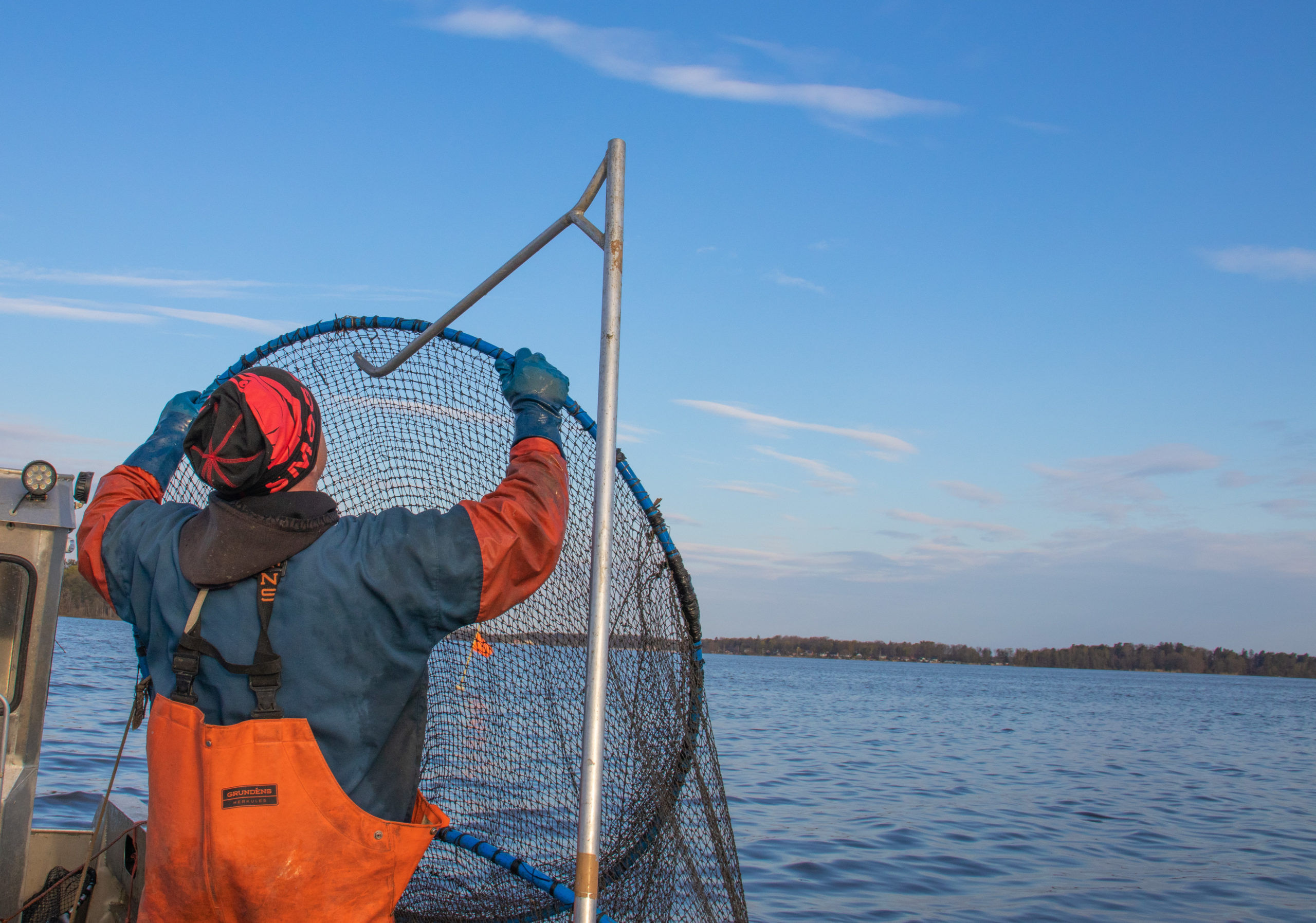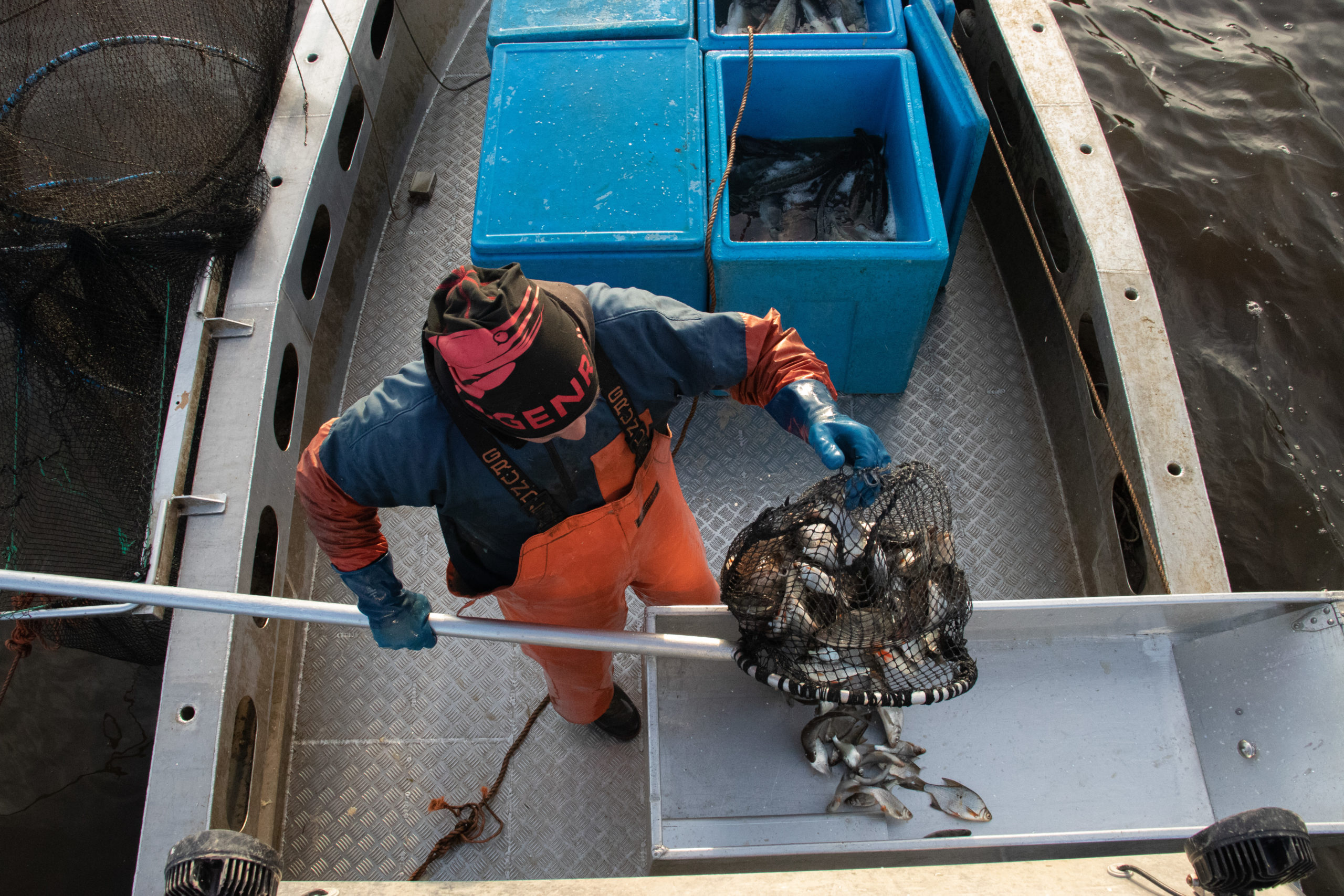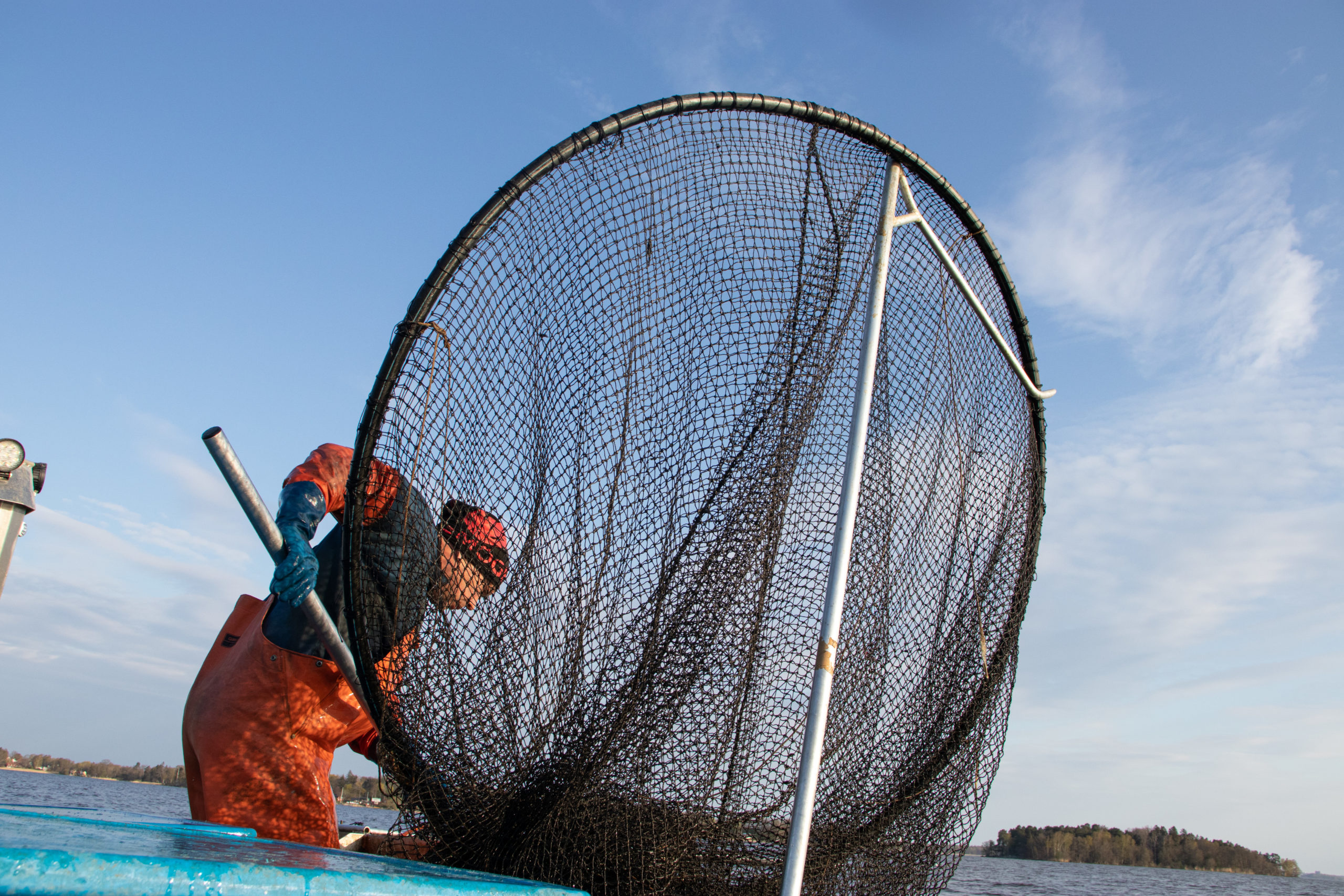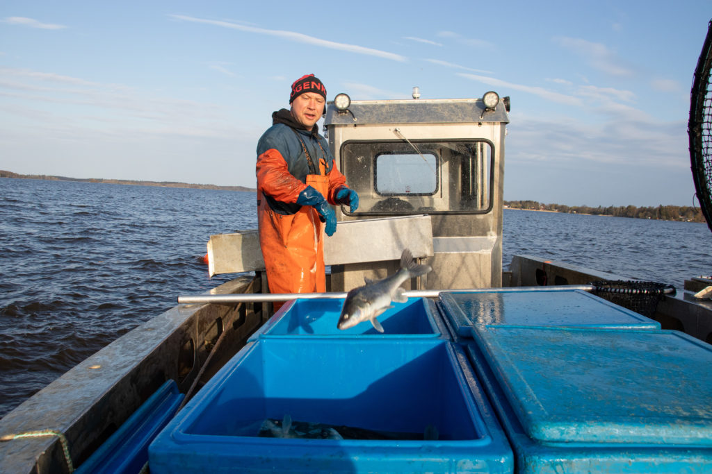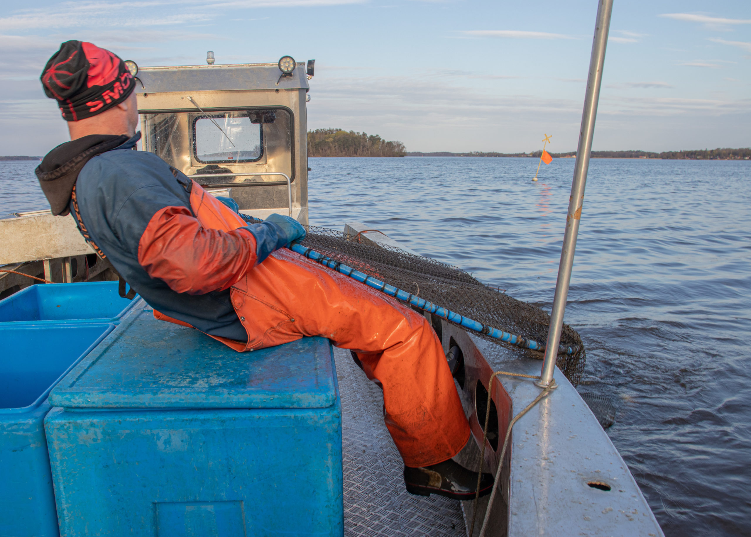 Mats Erikssons fiskemetod är en av de mer skonsamma för miljön. Ur bottengarnet tar han själv upp fisken med en håv. Ner i ett kärl åker gädda, gös, abborre, ål, lake och mört. När fiskarna är färdigsorterade öppnar han kärlet ut mot vattnet för att med en svepande hand föra tillbaka fiskarna som inte ska säljas.