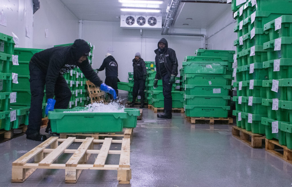 De två pallar av fisken som fångats på båtturen skickas i en container till Stockholms
