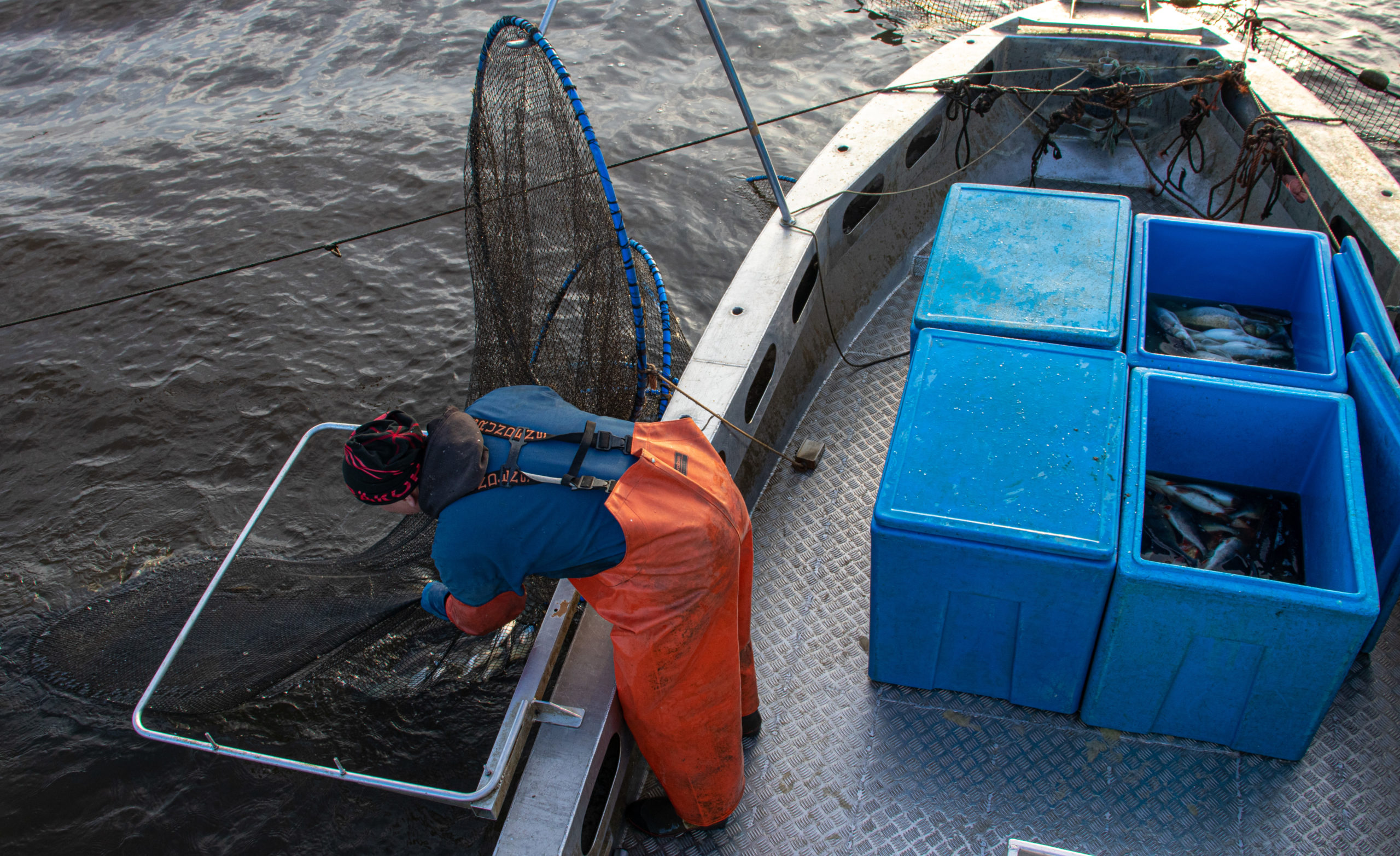 Eriksson sätter sig ner på båtkanten för att pilla bort fisken från garnet så att den åker ner i
